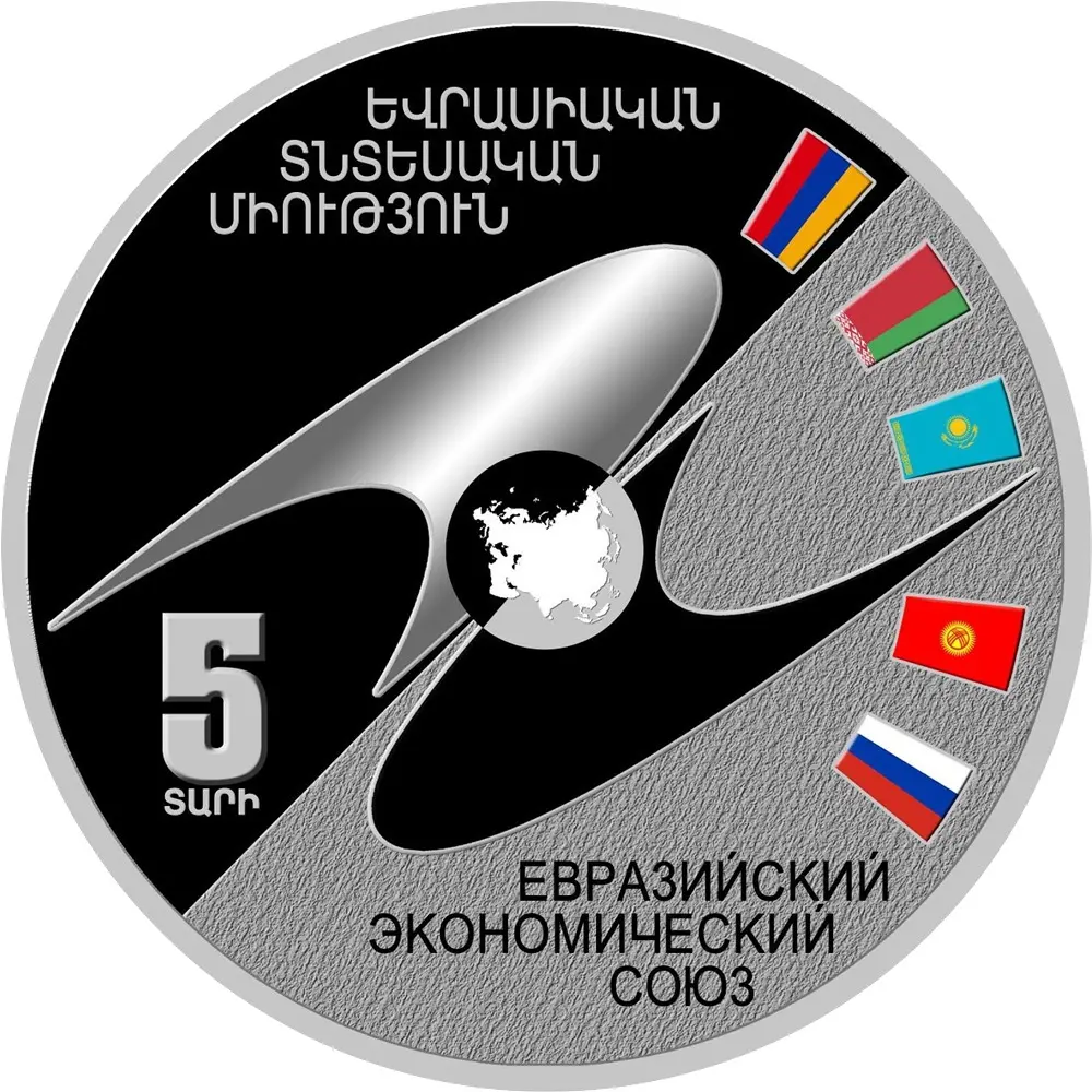 На реверсе в центральной части расположен логотип ЕЭС. В левой части отчеканена юбилейная дата на армянском и русском языках: - «5 տարի / ЛЕТ». В правой части находятся пять стилизованных изображений флагов стран-членов ЕАЭС: Армения, Белоруссия, Казахстан, Киргизия, Россия. В верхней части надпись на армянском языке, в нижней на русском - «Եվրասիական տնտեսական միություն» / «ЕВРАЗИЙСКИЙ ЭКОНОМИЧЕСКИЙ СОЮЗ»