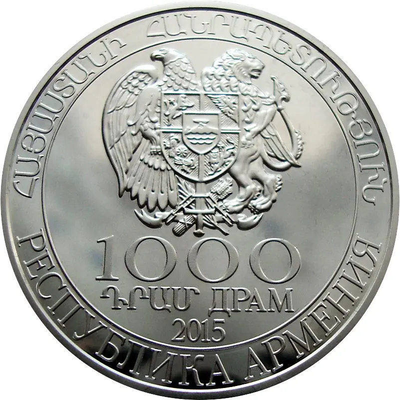 Изображен герб Республики Армения. По окружности выгравирована надпись «РЕСПУБЛИКА АРМЕНИЯ» на армянском и русском языках. В две строки указан номинал – «1000 драм» и обозначен год выпуска монеты – «2015».