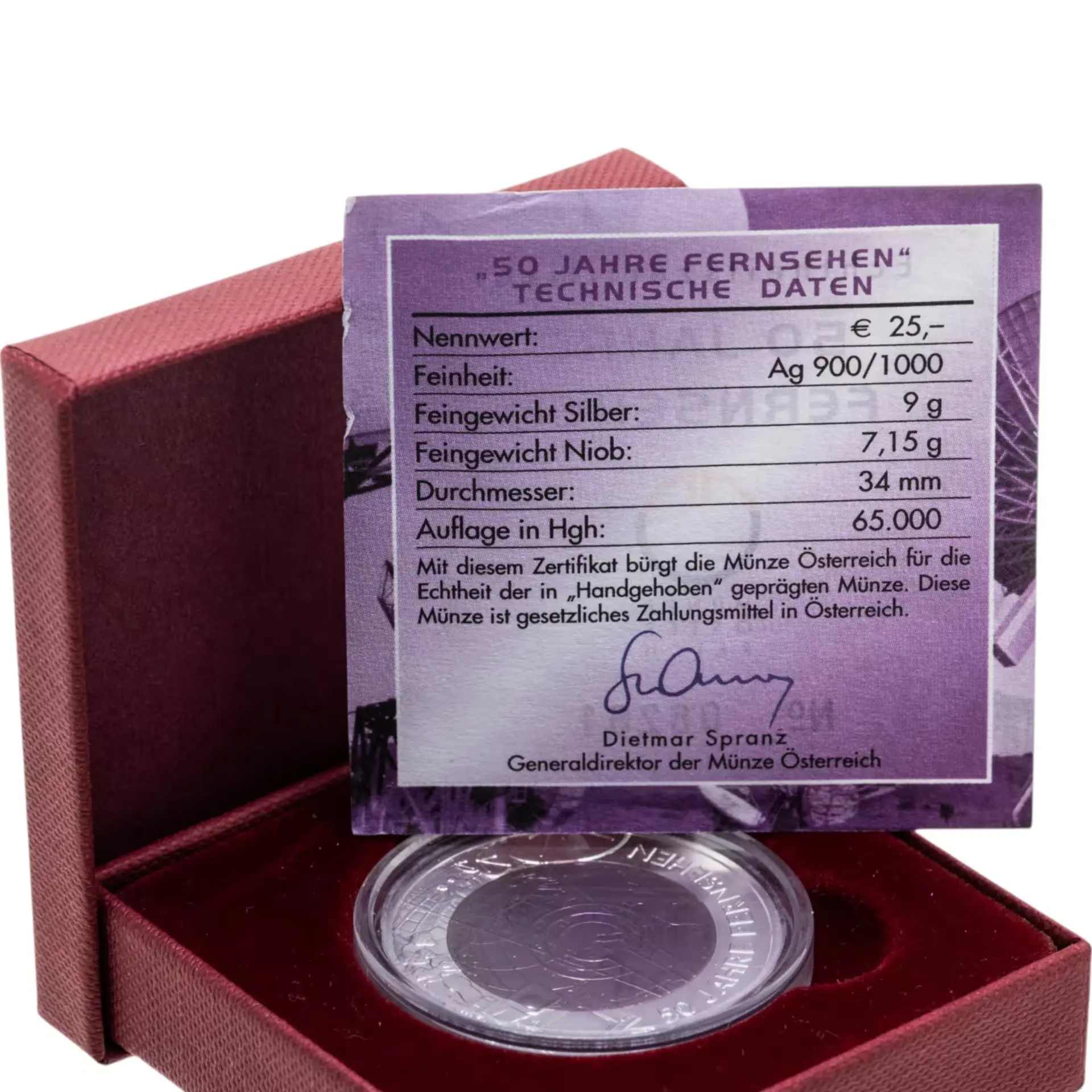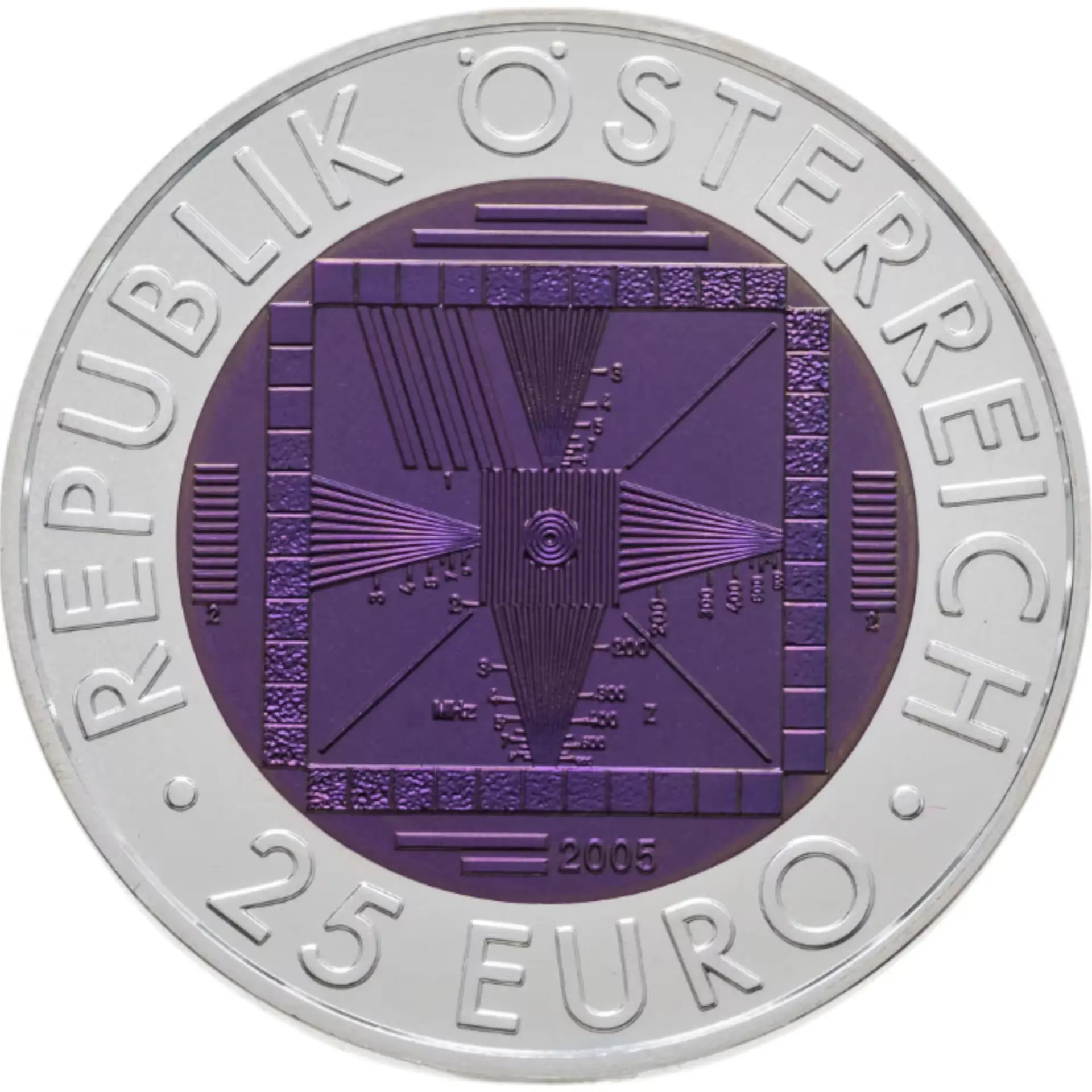 Изображена телевизионная тестовая таблица 1950 годов, под которой размещен год чеканки «2005». На внешнем серебряном кольце в верхней части нанесено название государства «REPUBLIK OSTERREICH», а внизу — номинал монеты «25 EURO».