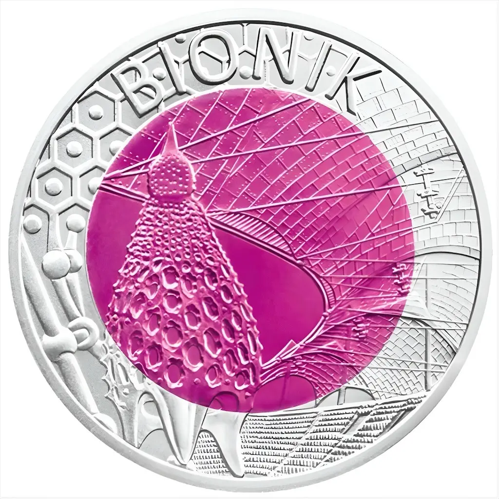 Реверс посвящен теме бионики в архитектуре. На внутреннем ниобиевом диске изображены расходящиеся лучи радиолярии (разновидность планктона, которая вдохновила испанского архитектора Антонио Гауди). Фоном для центрального изображения служит фрагмент крыши Олимпийского стадиона в Мюнхене, конструкция которой была разработана с использованием бионических принципов. На внешнем серебряном кольце представлены дополнительные примеры, взятые из бионики, а также надпись "BIONIK".