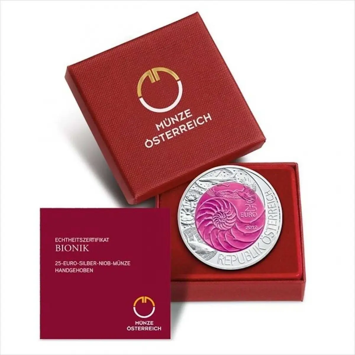На аверсе монеты, в центральной вставке из ниобия лилового цвета, изображен разрез панциря улитки наутилус. Такое строение часто служит образцом для современных архитектурных проектов. На внешнем серебряном кольце монеты представлены другие примеры вдохновения природой: акула, цветок лотоса (из-за его водоотталкивающих свойств) и птицы рядом с самолетом, что напоминает об орнитоптере Леонардо да Винчи. По ободу кольца отчеканена надпись на немецком языке: "REPUBLIK OSTERREICH" (Республика Австрия), номинал "25 EURO" и год выпуска "2012".