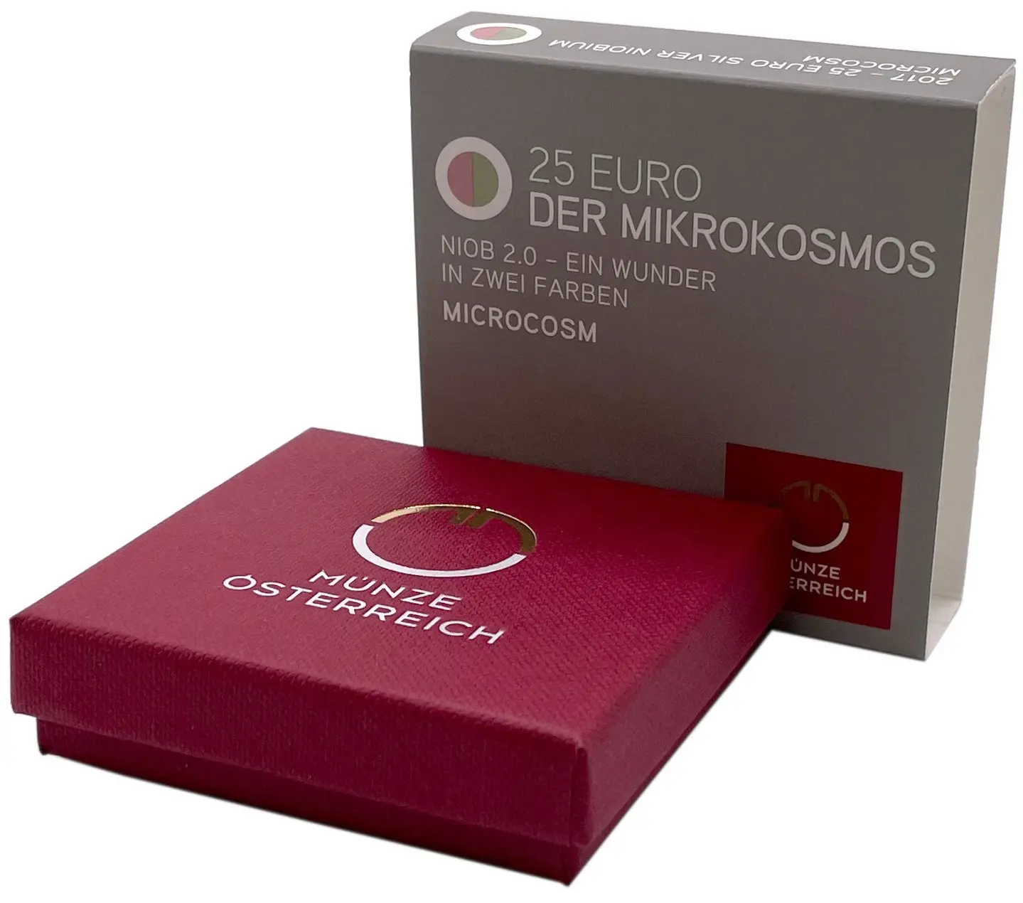 Над бабочкой размещён атомарный символ, символизирующий связь живой материи с фундаментальными элементами природы. По окружности серебряного кольца — молекулярные структуры и фрагменты крыльев, увеличенные словно под микроскопом: от тончайших чешуек до чётких геометрических узоров. В нижней части ободка расположены надписи REPUBLIK ÖSTERREICH, номинал 25 EURO и год выпуска 2017, гармонично вписанные в научно-органическую композицию.