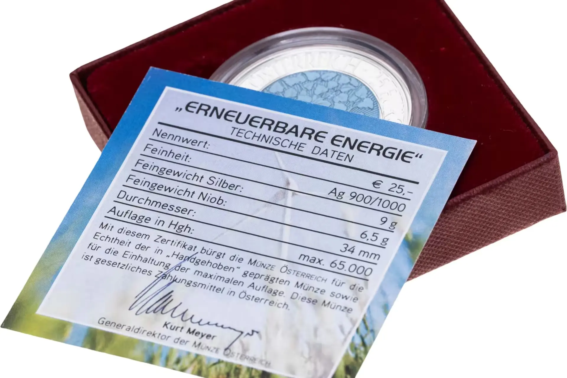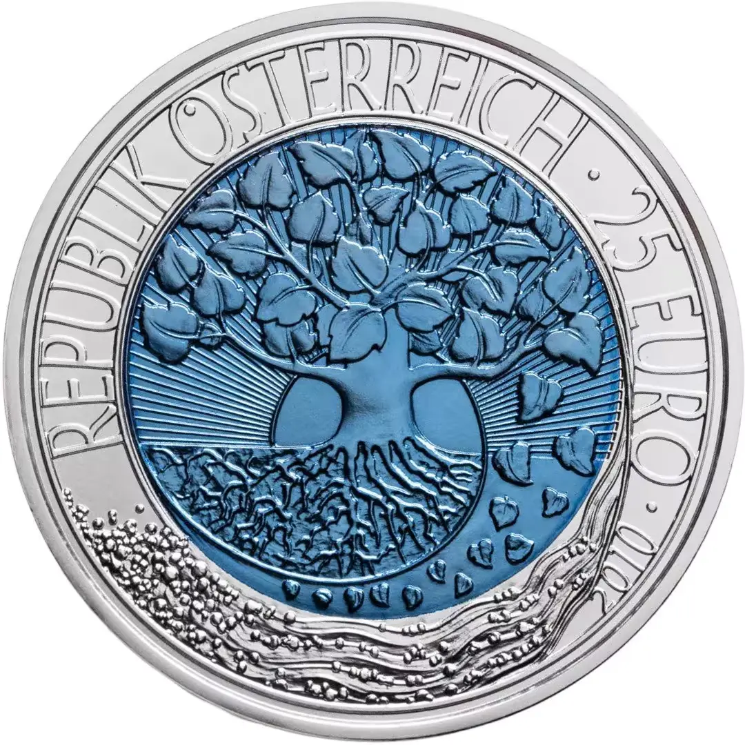 Изображено дерево, представляющее всю растительность планеты, от корней которого исходит спираль, отображающая жизненный цикл четырех стихий — земли, ветра, огня и воды. На внешнем серебряном кольце нанесено название государства «REPUBLIK OSTERREICH», а также указаны номинал «25 EURO» и год чеканки монеты «2010».