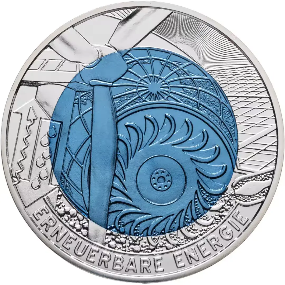На фоне земного шара изображена турбина, ветрогенератор и солнечная батарея. Внизу размещена надпись «ERNEUERBARE ENERGIE» («ВОЗОБНОВЛЯЕМАЯ ЭНЕРГИЯ»).