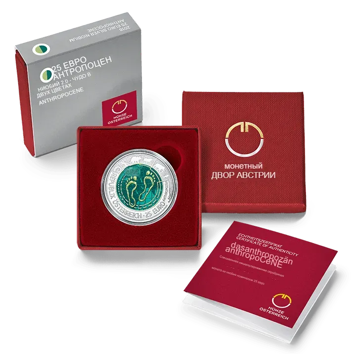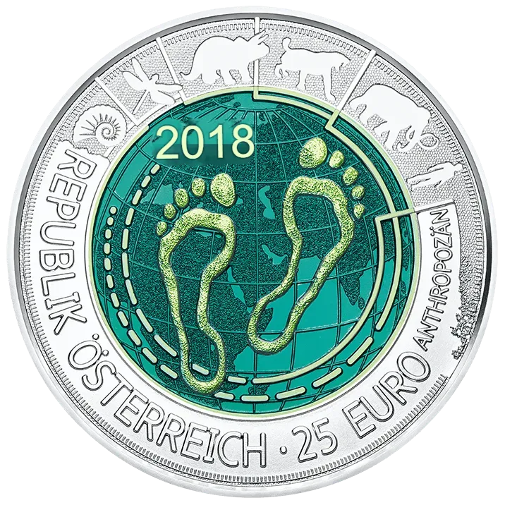 Давно ли мы живем в эпоху антропоцена? Серебряная ниобиевая монета 2018 года иллюстрирует, какие действия современных людей привели к серьезным изменениям в системе Земли. Наш след на Земле стал большим и глубоким. Сможем ли мы в будущем ступать более плавно?