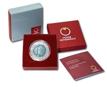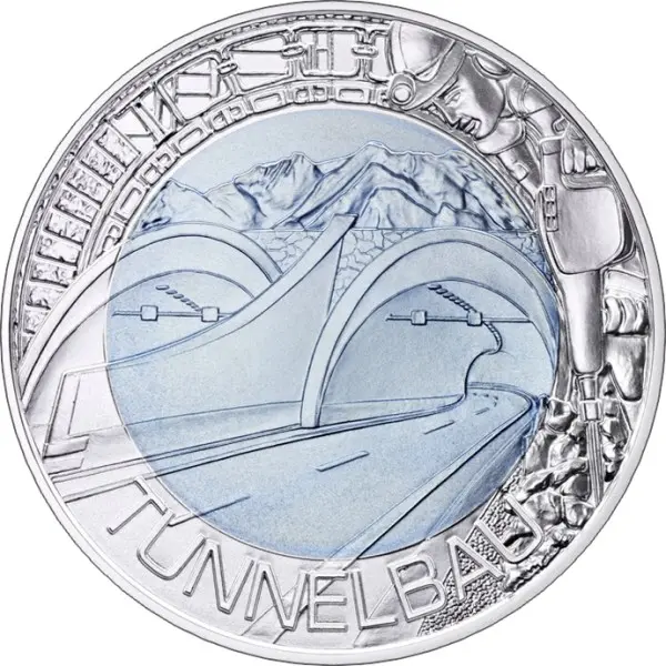 На реверсе в ниобиевом центре синеют альпийские вершины. На переднем плане – автомагистраль, уходящая в двойном тоннеле. В верхней левой части серебряного кольца представлен схематический вид укреплений тоннелей в XIX – начале XX веках. Справа изображен работающий проходчик с отбойным молотком в руках. Текст "TUNNELBAU" размещен в нижней части серебряного кольца.
