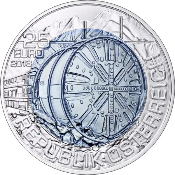 На аверсе монеты изображен тоннелепроходческий комплекс, врезающийся в горную гряду. В серебряном кольце с правой стороны имеется название страны-эмитента: "REPUBLIK ÖSTERREICH". Слева указан номинал монеты "25 EURO" в две строки и год эмиссии "2013".