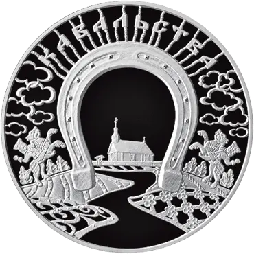 в центре на фоне декоративного белорусского сельского пейзажа – стилизованное изображение моста в виде подковы со стоящими по сторонам всадниками; внутри подковы – изображение деревенской церкви; вверху на витых кованых прутьях по кругу надпись: КАВАЛЬСТВА.