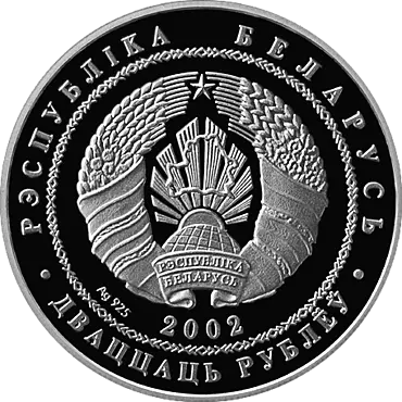 в круге, обрамленном геометрическим орнаментом, – рельефное изображение Государственного герба Республики Беларусь, под ним – год чеканки и проба сплава; по кругу надписи: в верхней части – "РЭСПУБЛIКА БЕЛАРУСЬ", в нижней – "ДВАЦЦАЦЬ РУБЛЁЎ".