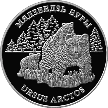 в центре – рельефное изображение трех медведей на фоне елового леса; вверху – надпись по кругу "МЯДЗВЕДЗЬ БУРЫ", внизу – "URSUS ARCTOS".