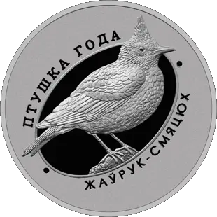 в центре в овале, символизирующем яйцо, – рельефное изображение птицы; по овалу надписи: слева – ПТУШКА ГОДА, справа – ЖАЎРУК-СМЯЦЮХ.
