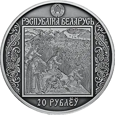 вверху – рельефное изображение Государственного герба Республики Беларусь, под ним надпись: РЭСПУБЛIКА БЕЛАРУСЬ; в центре – гравюра с титульного листа книги "Руфь", изданной Ф. Скориной; слева и справа – декоративный орнамент, в поле которого вписаны: слева – год чеканки, справа – проба сплава (на серебряной); внизу в центре – номинал: 20 РУБЛЁЎ (на серебряной) и 1 РУБЕЛЬ (на медно-никелевой).
