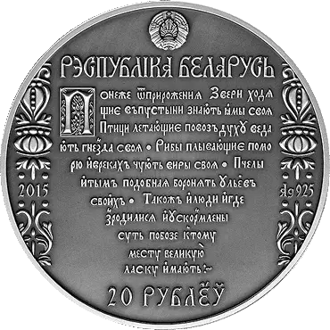 вверху – рельефное изображение Государственного герба Республики Беларусь, под ним надпись: РЭСПУБЛIКА БЕЛАРУСЬ; в центре – цитата о любви к Родине из предисловия к книге "Юдифь", изданной Ф. Скориной; слева и справа – декоративный орнамент, в поле которого вписаны: слева – год чеканки, справа – проба сплава (на серебряной); внизу в центре – номинал: 20 РУБЛЁЎ (на серебряной) и 1 РУБЕЛЬ (на медно-никелевой).