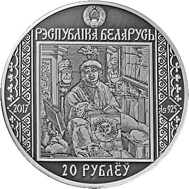 вверху – рельефное изображение Государственного герба Республики Беларусь, под ним надпись: РЭСПУБЛIКА БЕЛАРУСЬ; в центре – гравюра автопортрета Франциска Скорины из книги "Бытия", изданной Ф. Скориной; слева и справа – декоративный орнамент, в поле которого вписаны: слева – год чеканки, справа – проба сплава (на серебряной); внизу в центре – номинал: 20 РУБЛЁЎ (на серебряной) и 1 РУБЕЛЬ (на медно-никелевой).