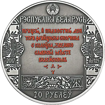 вверху – рельефное изображение Государственного герба Республики Беларусь, под ним надпись: РЭСПУБЛIКА БЕЛАРУСЬ; в центре – цитата из послесловия к "Часословцу" из "Малой подорожной книжицы", изданной Ф. Скориной (для серебряной монеты цитата выполнена с использованием технологии тампопечати); под ней – декоративный элемент из "Малой подорожной книжицы"; слева и справа – фрагменты иллюстраций из "Малой подорожной книжицы", в поле которых вписаны: слева – год чеканки, справа – проба сплава (на серебряной); внизу – номинал: 20 РУБЛЁЎ (на серебряной) и 1 РУБЕЛЬ (на медно-никелевой).