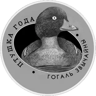 в центре, в овале, символизирующем яйцо, – рельефное изображение птицы; по овалу надписи: слева – ПТУШКА ГОДА, справа – ГОГАЛЬ ЗВЫЧАЙНЫ.