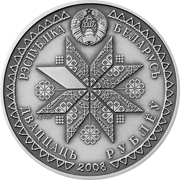 в круге, обрамленном геометрическим орнаментом, – рельефное изображение Государственного герба Республики Беларусь; в центре – солярный знак, состоящий из восьмиконечной геометрической фигуры с элементами декора, символизирующий солнечные лучи; под ним указаны: год чеканки, на серебряной – проба сплава; по кругу надписи: в верхней части – РЭСПУБЛІКА БЕЛАРУСЬ, в нижней – ДВАЦЦАЦЬ РУБЛЁЎ (на серебряной) и АДЗІН РУБЕЛЬ (на медно–никелевой).