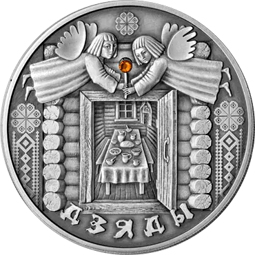 в центре – изображен интерьер деревенской хаты, в которой накрыт стол для поминовения усопших; вверху – над входом в хату два ангела держат свечу (на серебряной монете вставка из синтетического кристалла оранжевого цвета имитирует пламя); слева, справа и вверху – рельефные элементы белорусского национального орнамента с мотивами Души; внизу по кругу надпись: ДЗЯДЫ.
