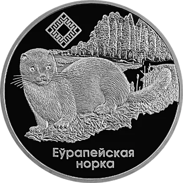 в центральной части, на фоне фрагмента пейзажа заповедника, – рельефное изображение европейской норки, вверху – изображение фрагмента традиционного белорусского орнамента, означающего символ жизни, внизу – надпись: "ЕЎРАПЕЙСКАЯ НОРКА".