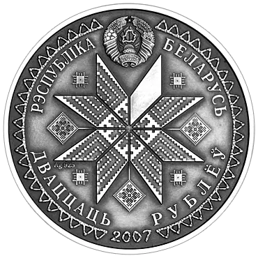 в круге, обрамленном геометрическим орнаментом, – рельефное изображение Государственного герба Республики Беларусь; в центре – солярный знак, состоящий из восьмиконечной геометрической фигуры с элементами декора, символизирующий солнечные лучи; под ним указаны год чеканки (на серебряной – проба сплава); по кругу надписи: вверху – РЭСПУБЛІКА БЕЛАРУСЬ, внизу – ДВАЦЦАЦЬ РУБЛЁЎ (на серебряной) и АДЗІН РУБЕЛЬ (на медно – никелевой).