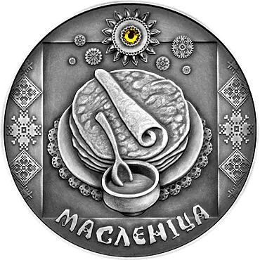 в центре – рельефное изображение непременного атрибута праздника МАСЛЕНІЦА – блинов, под ними – глиняный горшочек со сметаной и деревянной ложкой; вверху – рельефное изображение солнца и снежинок, символизирующих встречу зимы с весной (на серебряной монете в центре солнца – вставка из синтетического кристалла желтого цвета); слева и справа – рельефные элементы белорусского национального орнамента; внизу по кругу надпись: МАСЛЕНІЦА.