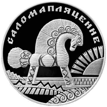 в центре — изображение соломенного конька на фоне декоративного стилизованного белорусского пейзажа, выполненного в технике соломенной аппликации; вверху по кругу надпись: САЛОМАПЛЯЦЕННЕ.