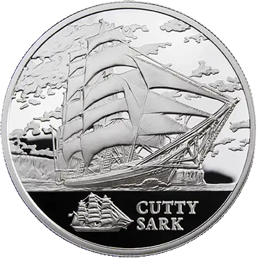 в центре – изображение единственного в мире сохранившегося на данный момент чайного клипера "Катти Сарк (Сutty Sark)" на фоне морского пейзажа, снизу – уменьшенное изображение данного корабля (вид сбоку), справа от него надпись: CUTTY SARK.