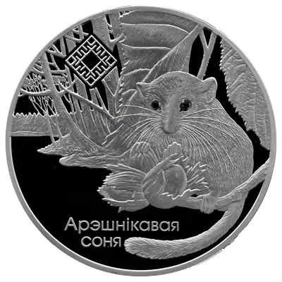 в центре - рельефное изображение орешниковая соня на фоне стилизованного пейзажа заказника Ситязянский; вверху – изображение фрагмента традиционного белорусского орнамента, означающего символ жизни; внизу – надпись: АРЭШНІКАВАЯ СОНЯ.