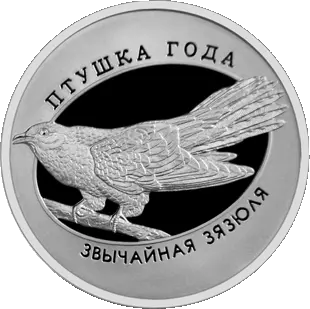 в центре – рельефное изображение кукушки (она признана в Беларуси в 2014 году Птицей года); по кругу надписи: вверху – ПТУШКА ГОДА, внизу – ЗВЫЧАЙНАЯ ЗЯЗЮЛЯ.