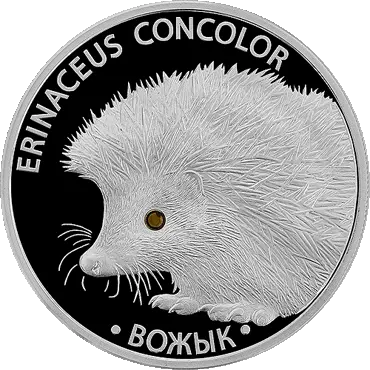 в центре – рельефное изображение ежика (вид сбоку), в глазу – вставка из бриллианта (на золотой) и из кристалла Сваровски (на серебряной); по кругу надписи: вверху – ERINACEUS CONCOLOR, внизу ВОЖЫК.