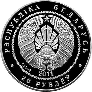 в центре в круге, обрамленном геометрическим орнаментом, рельефное изображение Государственного герба Республики Беларусь, под ним – год чеканки, слева – проба сплава; по кругу надписи: вверху - РЭСПУБЛIКА БЕЛАРУСЬ, внизу – номинал: 50 РУБЛЁЎ (на золотой) и 20 РУБЛЁЎ (на серебряной).