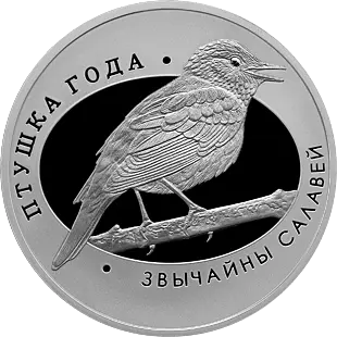 рельефное изображение обыкновенного соловья, сидящего на ветке (он признан в Беларуси в 2007 году Птицей года); по кругу надписи: вверху – ПТУШКА ГОДА, внизу – ЗВЫЧАЙНЫ САЛАВЕЙ.