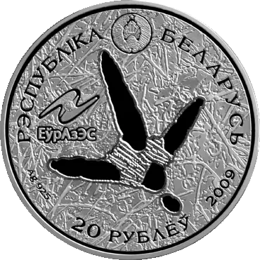 вверху — рельефное изображение Государственного герба Республики Беларусь; в центре на фоне фактуры травы изображен след аиста, слева — знак ЕврАзЭС и надпись: ЕўрАзЭС; по кругу надписи: вверху — РЭСПУБЛIКА БЕЛАРУСЬ, внизу — проба сплава (на серебряных), номинал — 100 РУБЛЁЎ и 20 РУБЛЁЎ (на серебряных), 1 РУБЕЛЬ (на медно-никелевой) и год чеканки.