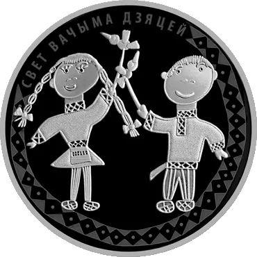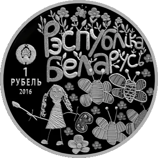 слева – рельефное изображение Государственного герба Республики Беларусь, под ним – надписи: номинал 20 РУБЛЁЎ (на серебряной) и 1 РУБЕЛЬ (на медно-никелевой), год выпуска и проба сплава (на серебряной монете); справа вверху – стилизованная надпись в две строки: РЭСПУБЛІКА БЕЛАРУСЬ; внизу – композиция из детских рисунков.
