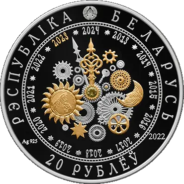 Во внутреннем круге в центре – композиция, состоящая из элементов часового механизма, Солнца и Луны; в центре часового механизма – вставка из фианита; по кругу – числа, обозначающие годы с 2013 по 2024, по количеству лет одного цикла китайского лунного календаря; золотом выделены отдельные элементы центральной композиции и 2023 (год Кролика).