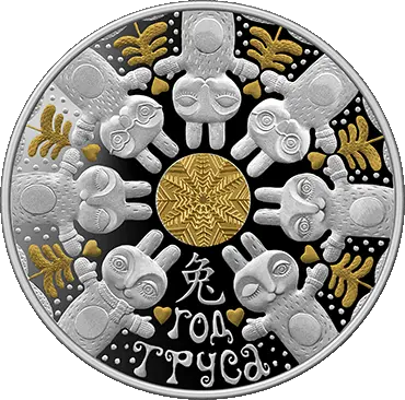 в центре стилизованное изображение снежинки и кроликов, по периметру монеты – декоративные элементы, внизу – изображение китайского иероглифа, обозначающего кроликa, и надпись: ГОД ТРУСА.