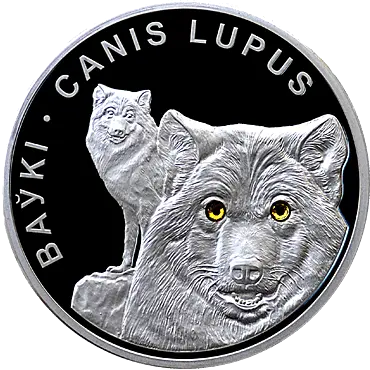 в центре – рельефное изображение головы волка, в глазах – вставки из кристалла Сваровски; на заднем плане – рельефное изображение стоящего на камне волка, вверху по кругу надпись: ВАЎКІ * CANIS LUPUS.
