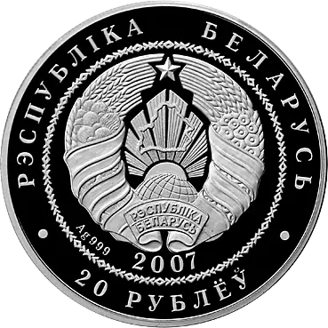 в центре в круге, обрамленном геометрическим орнаментом, – рельефное изображение Государственного герба Республики Беларусь, под ним указан год чеканки, проба сплава; по кругу надписи: вверху – РЭСПУБЛIКА БЕЛАРУСЬ, внизу – 20 РУБЛЁЎ.