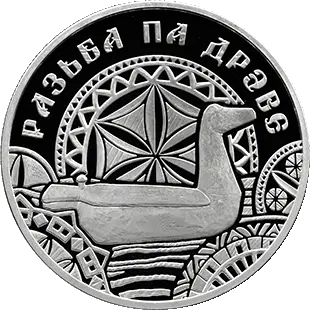 в центре – деревянная утка-солонка, вокруг – резная декоративная композиция, сверху надпись – РАЗЬБА ПА ДРЭВЕ.