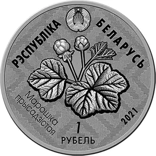 на фоне орнаментального полотна расположены: вверху – рельефное изображение Государственного герба Республики Беларусь и надпись: РЭСПУБЛІКА БЕЛАРУСЬ; в центре – изображение морошки приземестой; под ним номинал: 20 РУБЛЁЎ (на серебряной) и 1 РУБЕЛЬ (на медно-никелевой); слева – надпись: МАРОШКА ПРЫСАДЗІСТАЯ и проба сплава (на серебряной); справа – год чеканки.
