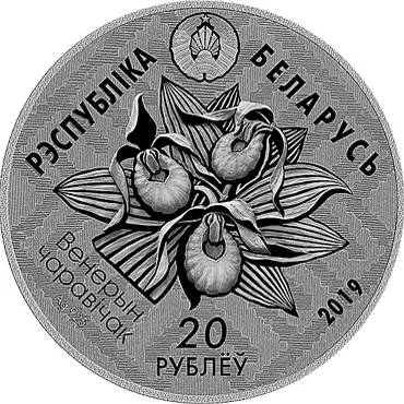 на фоне орнаментального полотна расположены: вверху – рельефное изображение Государственного герба Республики Беларусь и надпись: РЭСПУБЛІКА БЕЛАРУСЬ; в центре – изображение цветущего растения; под ним номинал: 20 РУБЛЁЎ (на серебряной) и 1 РУБЕЛЬ (на медно-никелевой); слева надпись: Венерын чаравічак и проба сплава (на серебряной); справа – год чеканки.