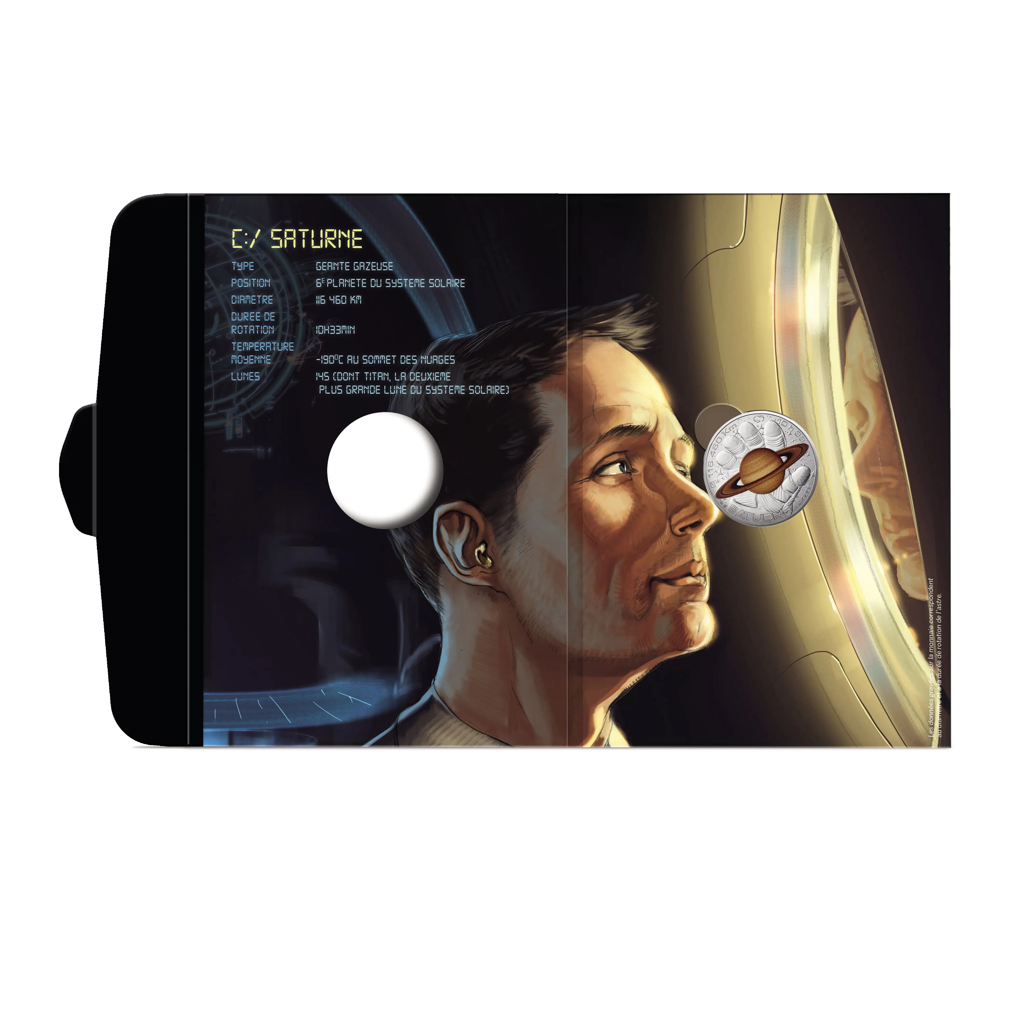 На аверсе изображён Сатурн, лежащий на раскрытой ладони астронавта. На заднем плане представлен звёздный космос. Композиция создаёт эффект присутствия — будто наблюдатель смотрит на сцену изнутри шлема скафандра. По краю монеты нанесены характеристики планеты: диаметр «116 460 km» и период вращения «10h33».
