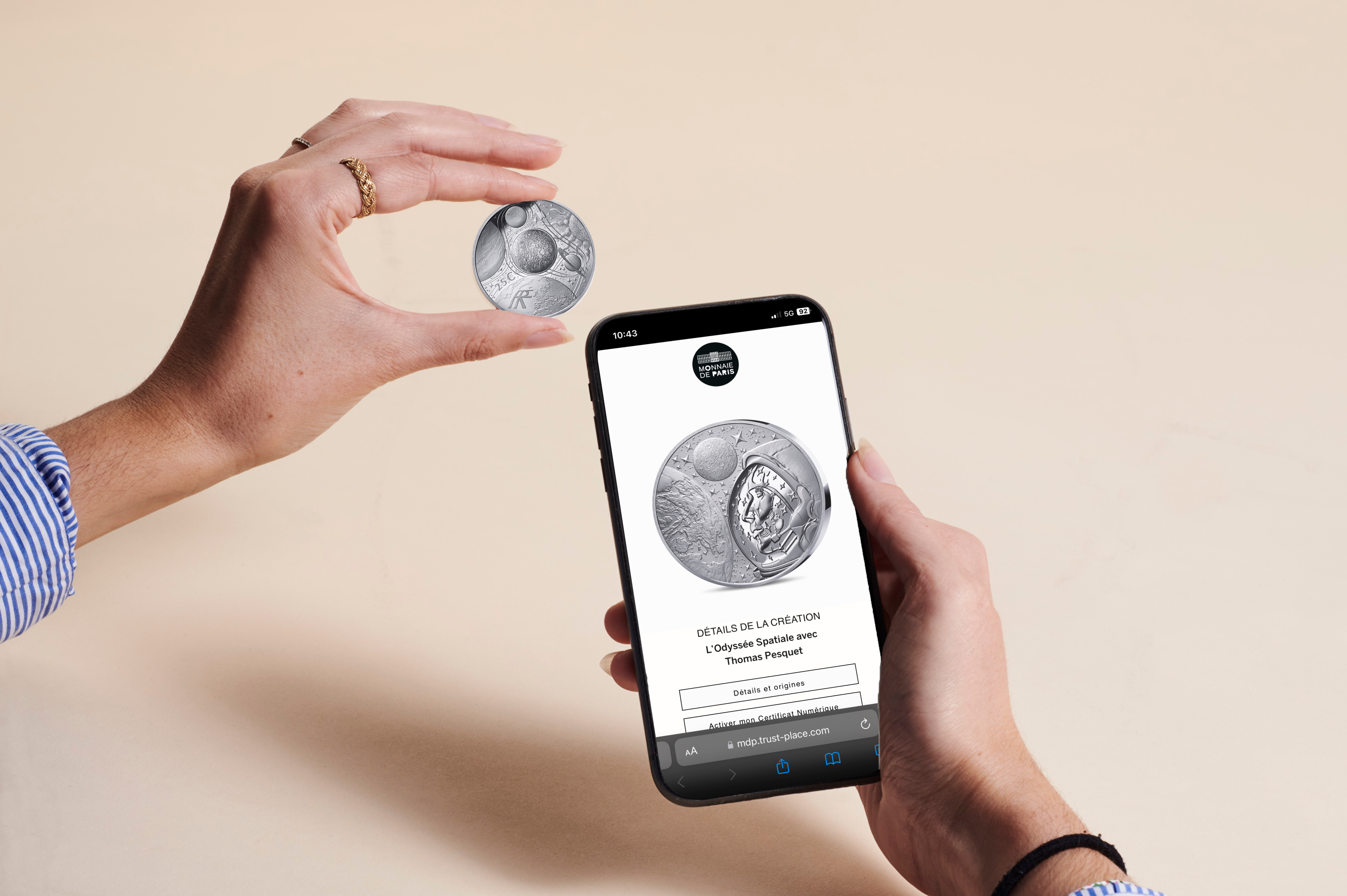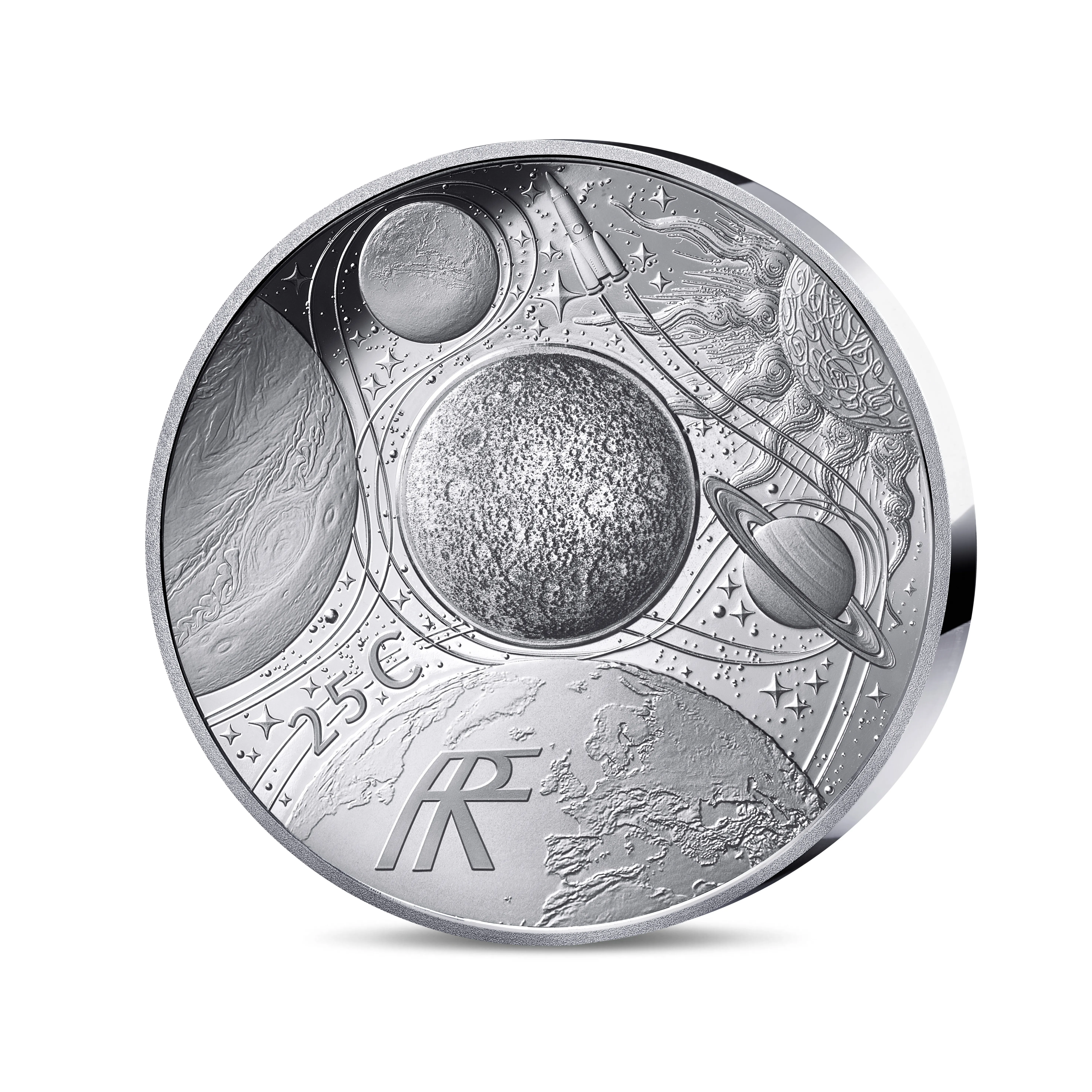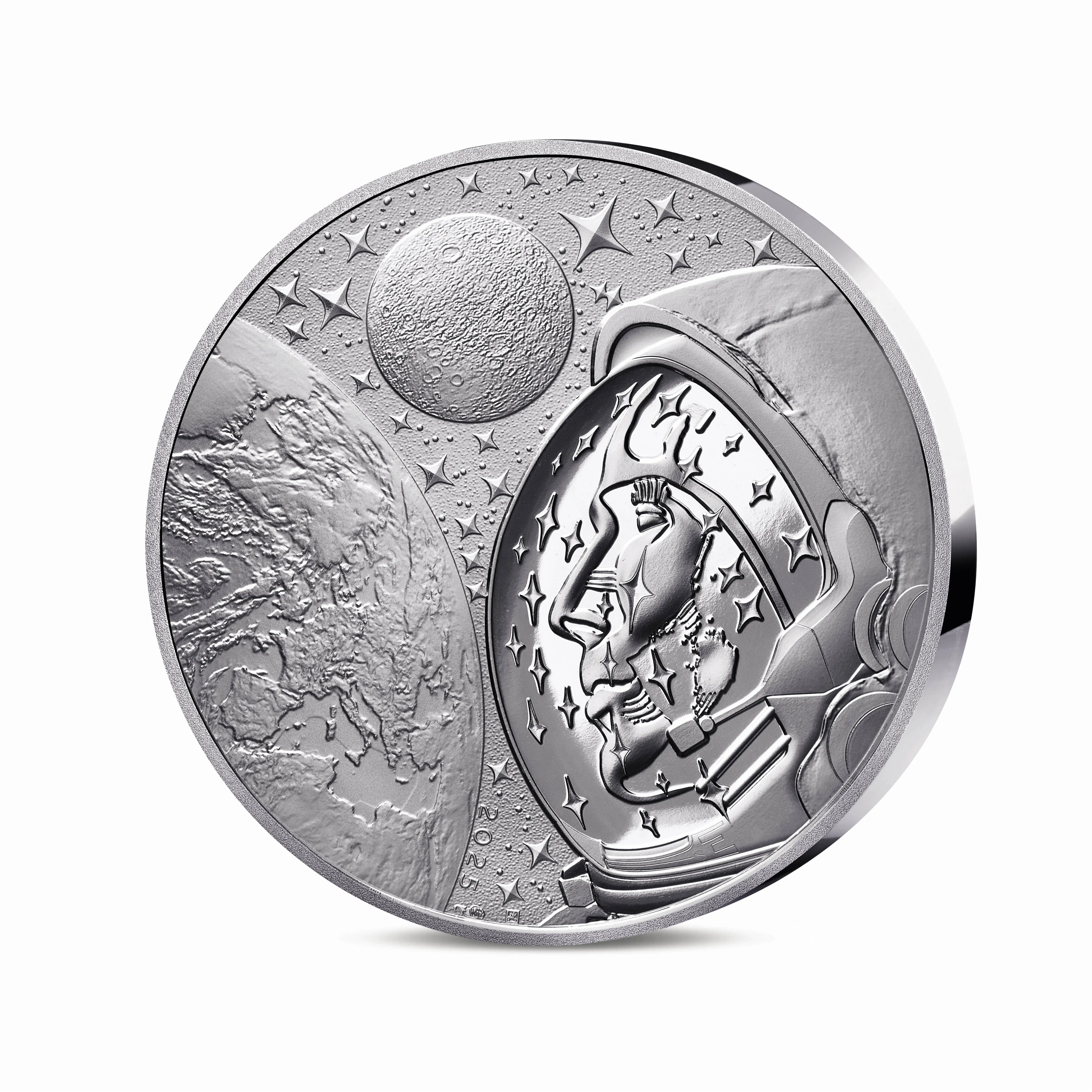 Серебряная монета 25 евро 2025 года (2 унции) из серии «Космическая одиссея с Томасом Песке» является инновационным выпуском с технологией connected coin. Она сопровождается цифровым сертификатом владения и дополнительным контентом, доступным через приложение Monnaie de Paris, включая материалы и интервью с астронавтом. Монета объединяет тему космических исследований с современными технологиями, позволяя владельцу глубже погрузиться в концепцию серии.