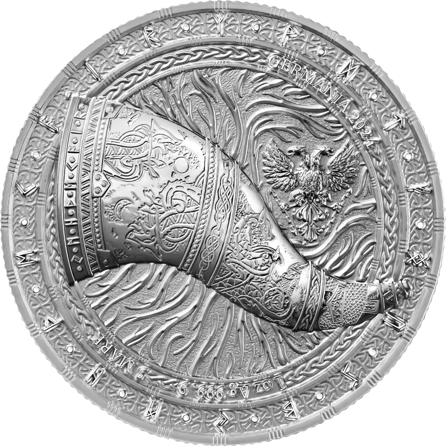 - Часто присутствуют надписи вроде “Gjallarhorn”, год выпуска (2024), проба металла Ag 999.9 и номинал 5 Mark (хотя это номинал-символ, а не денежный нацвалюты).