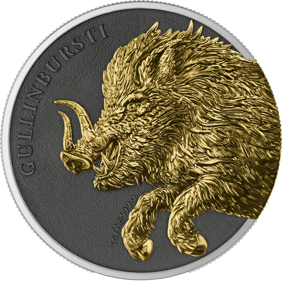 На аверсе размещён динамичный образ кабана Гуллинбурсти, запечатлённого в движении или с мощным профилем, подчёркивая его силу и скорость.