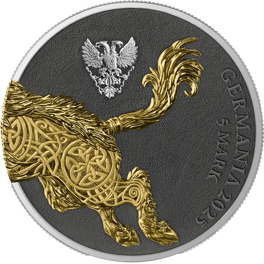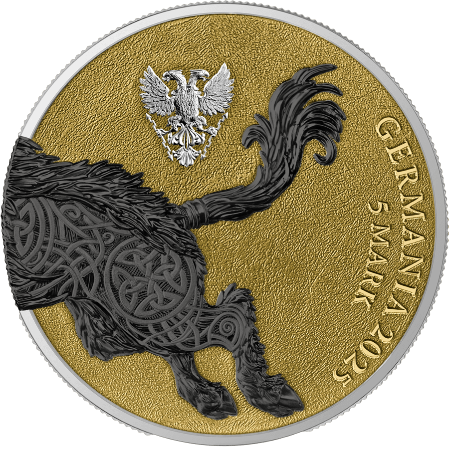 Реверс оформлен двуглавым орлом Germania Mint — традиционным символом серии, вокруг которого размещены год выпуска (2025) и номинал 5 MARK.