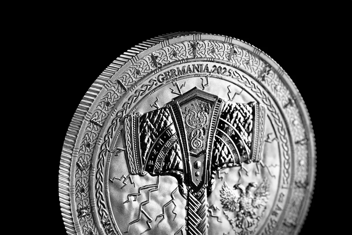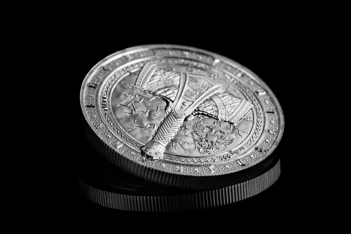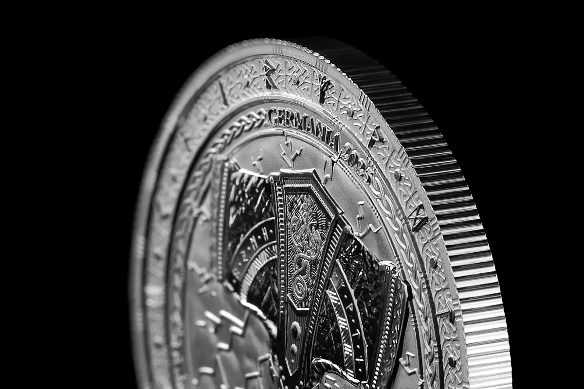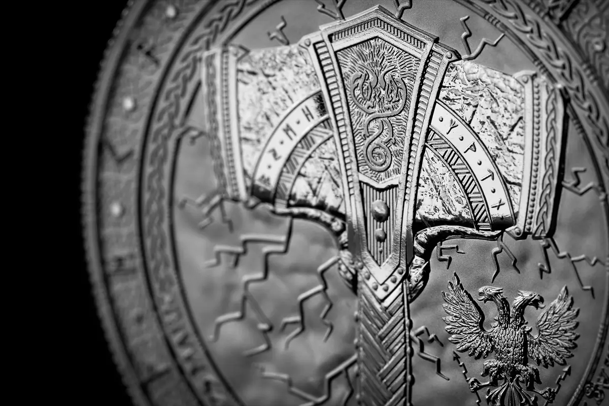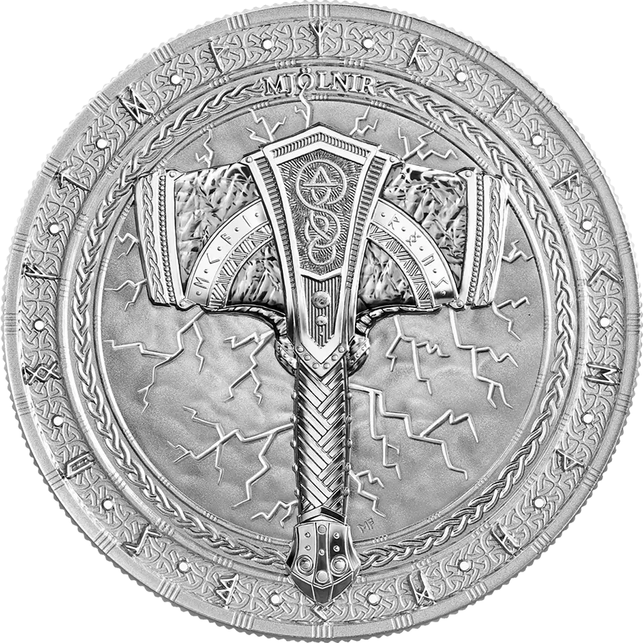 Эта серебряная монета посвящена легендарному молоту Тора — Мьёльниру, одному из самых мощных артефактов скандинавской мифологии. Мьёльнир был выкован мастерами-гномами и обладал способностью наносить разрушительные удары и всегда возвращаться к руке своего хозяина, бога грома Тора. Монета символизирует силу, защиту и легендарное наследие древних мифов.
