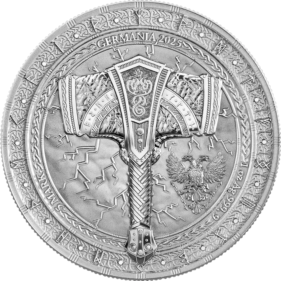 - Вокруг реверса может быть указано коллекционный номинал (5 Mark), а также название Germania Mint.