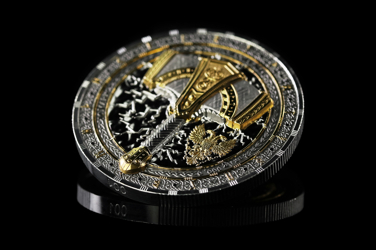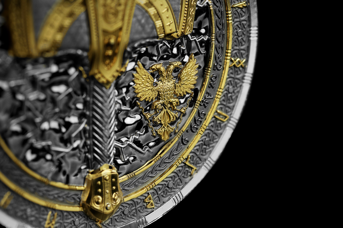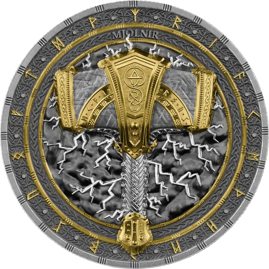 Эта серебряная монета посвящена легендарному молоту Тора — Мьёльниру, одному из самых мощных артефактов скандинавской мифологии. Мьёльнир был выкован мастерами-гномами и обладал способностью наносить разрушительные удары и всегда возвращаться к руке своего хозяина, бога грома Тора. Монета символизирует силу, защиту и легендарное наследие древних мифов.