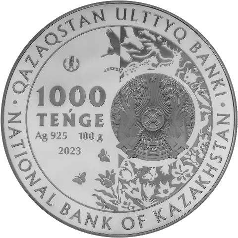 В верхней части указана надпись «1000 ТЕҢГЕ», обозначающая номинал. Также присутствуют характеристики металла — «Ag 925 100 g» и логотип Национального банка Казахстана.